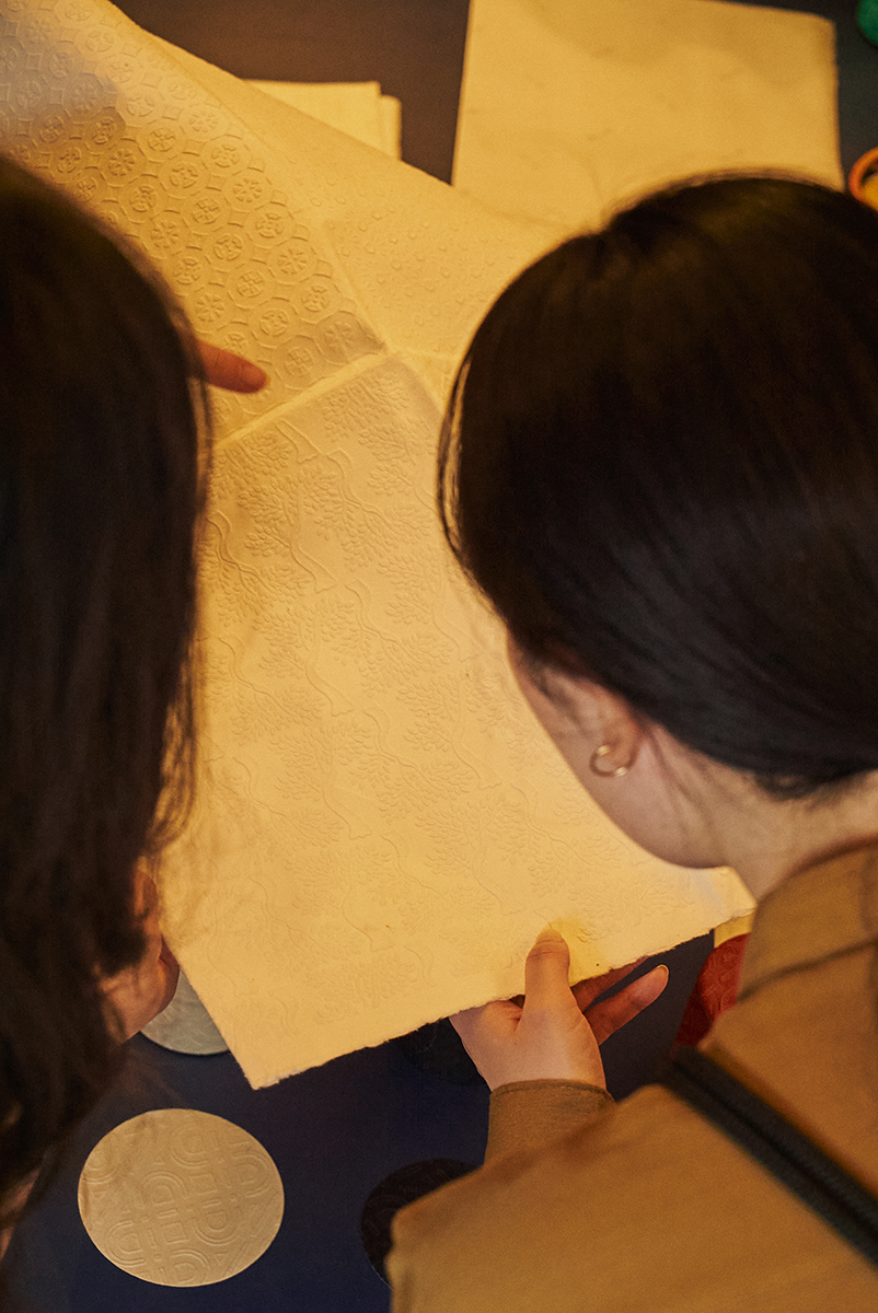 気泡を半立体的にデフォルメして再現することで、浮き紙ならではの陰影の魅力を新たな角度から発見できるのではと考えました。日本文化の包み慎む精神、優しく柔らかな心を感じ取っていただければ幸いです。