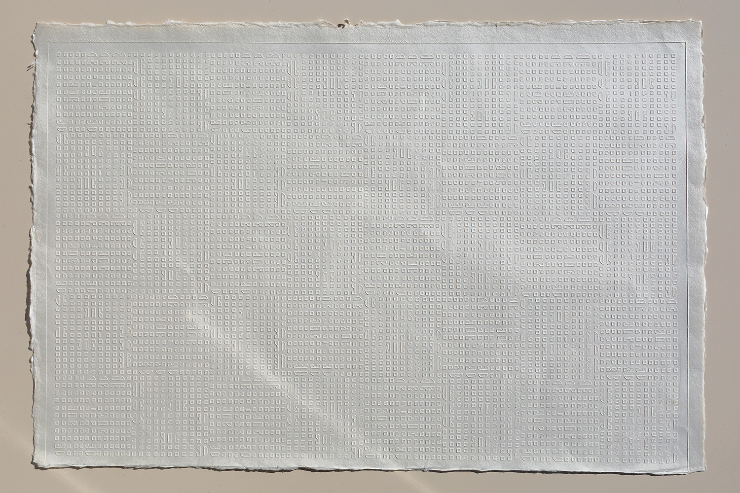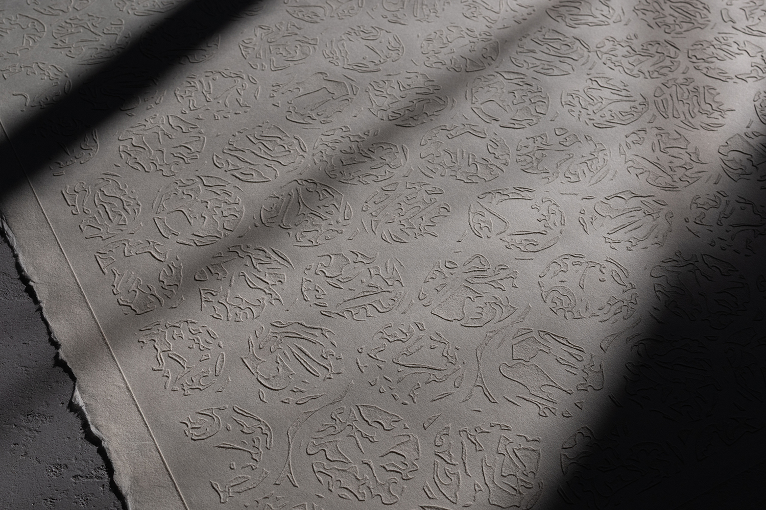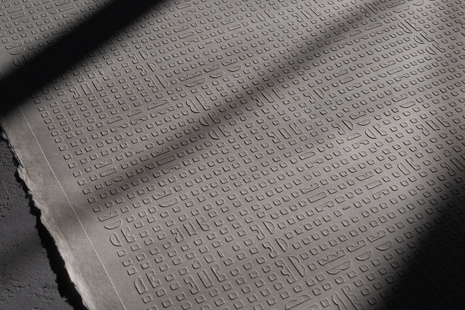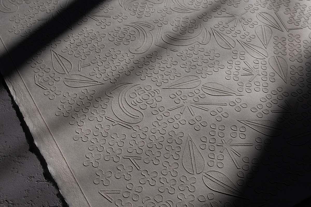 浮き紙の持つ平面の美しさと陰影によって柄が浮いたように半立体的に見える特性を使い、少し遊び心を入れ、見る角度によって隠し絵的に文字が浮き上がれば面白いのではと考えました。